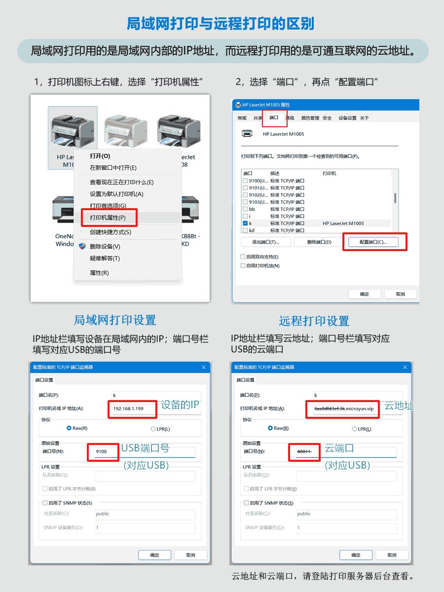 远程打印是通过设备里面生成的“远程打印地址”/”云地址“和“远程打印端口”/“云端口”安装的打印机 如下图对比: